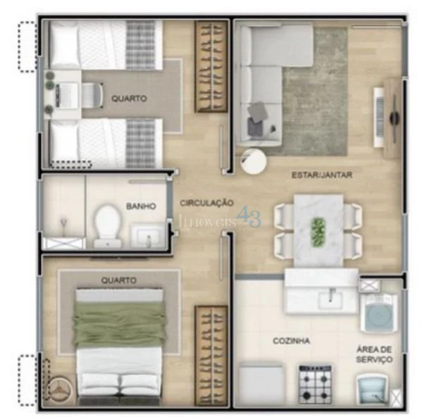 Distribuição: 02 dormitórios aconchegantes, sala de estar/TV, cozinha funcional e 01 banheiro social.